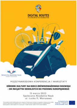 Wydarzenie odbyło się w marcu 2023 roku i było zakończeniem projektu Erasmus+ DIGITALROUTES@CULTURE. Hasłem konferencji było "OŚRODKI KULTURY NA RZECZ ZRÓWNOWAŻONEGO ROZWOJU - OD INICJATYW ODDOLNYCH DO POZIOMU EUROPEJSKIEGO". Spotkanie miało miejsce w budynku Społecznej Akademii Nauk w Warszawie, a skierowane było do pracowników środków kultury, domów kultury, organizacji pozarządowych z sektora kultury oraz edukatorów, przedstawicieli sektora dziedzictwa kulturowego, organizacji pozarządowych, stowarzyszeń, młodych osób czy ekspertów ds. pracy z młodzieżą.