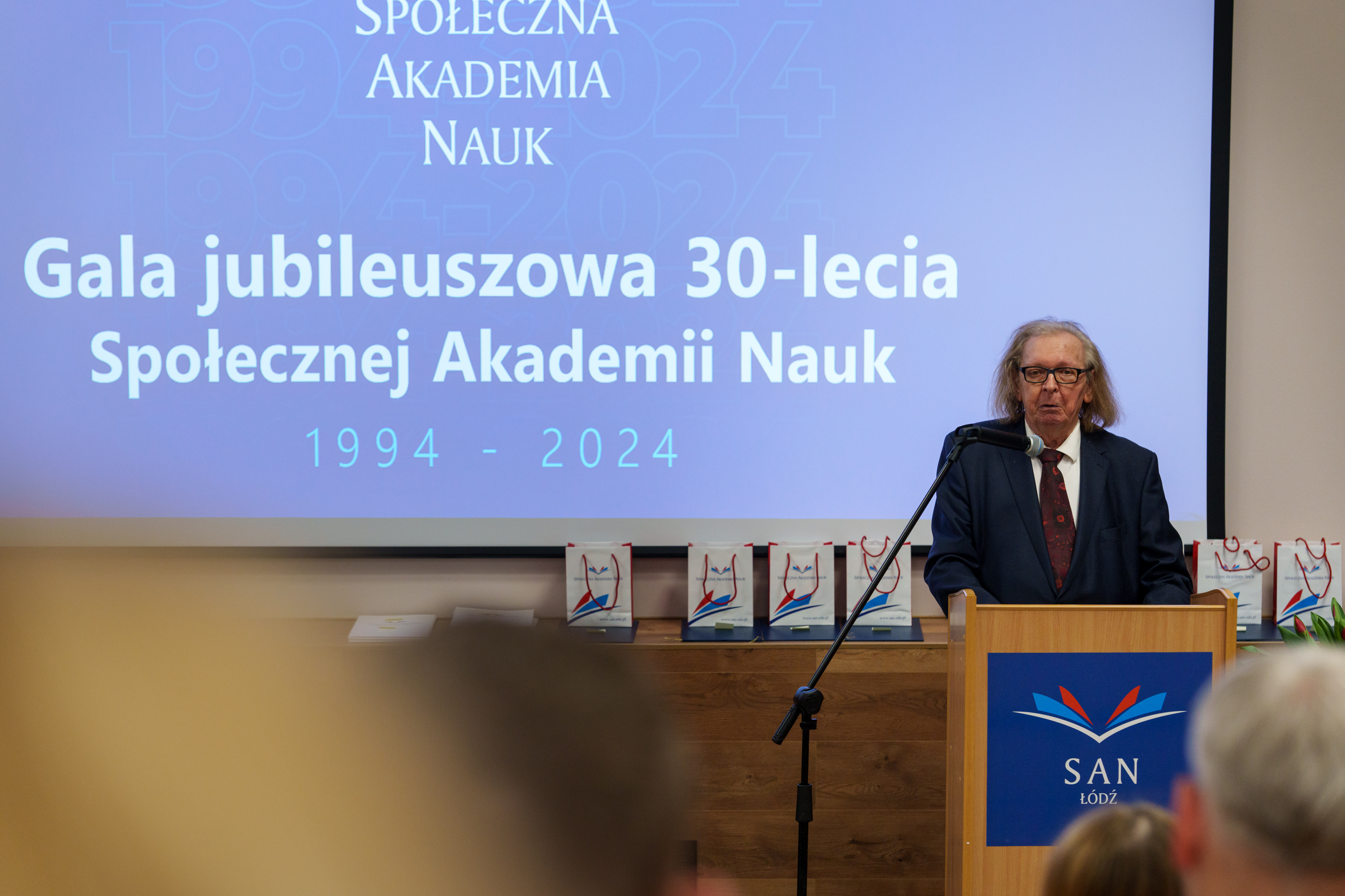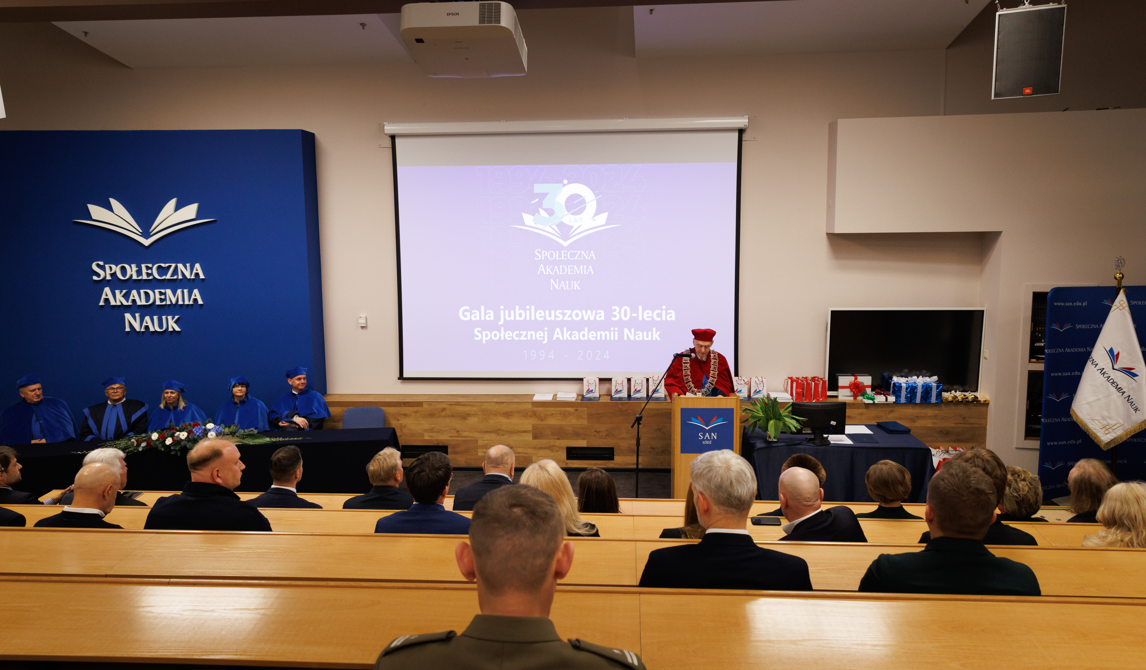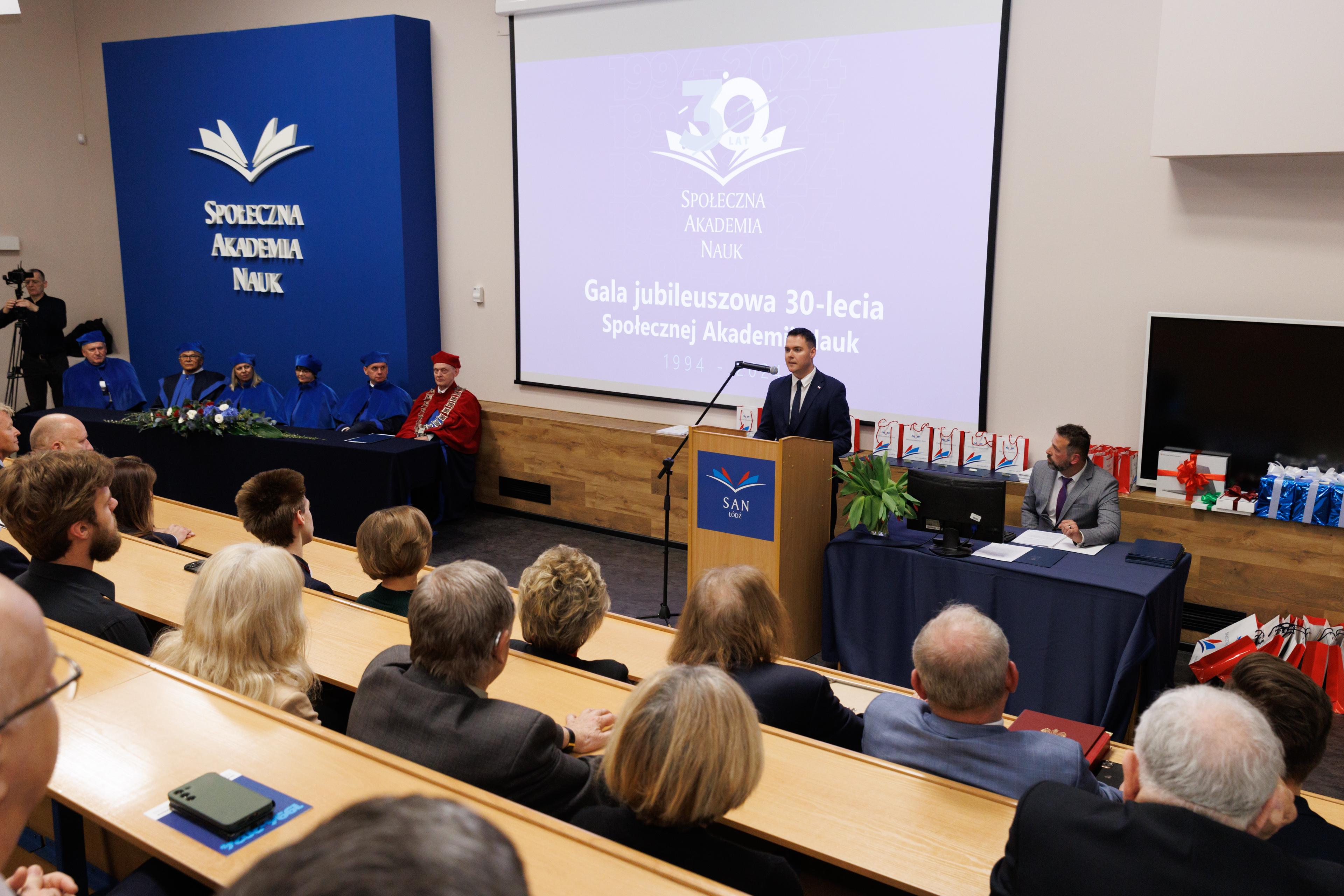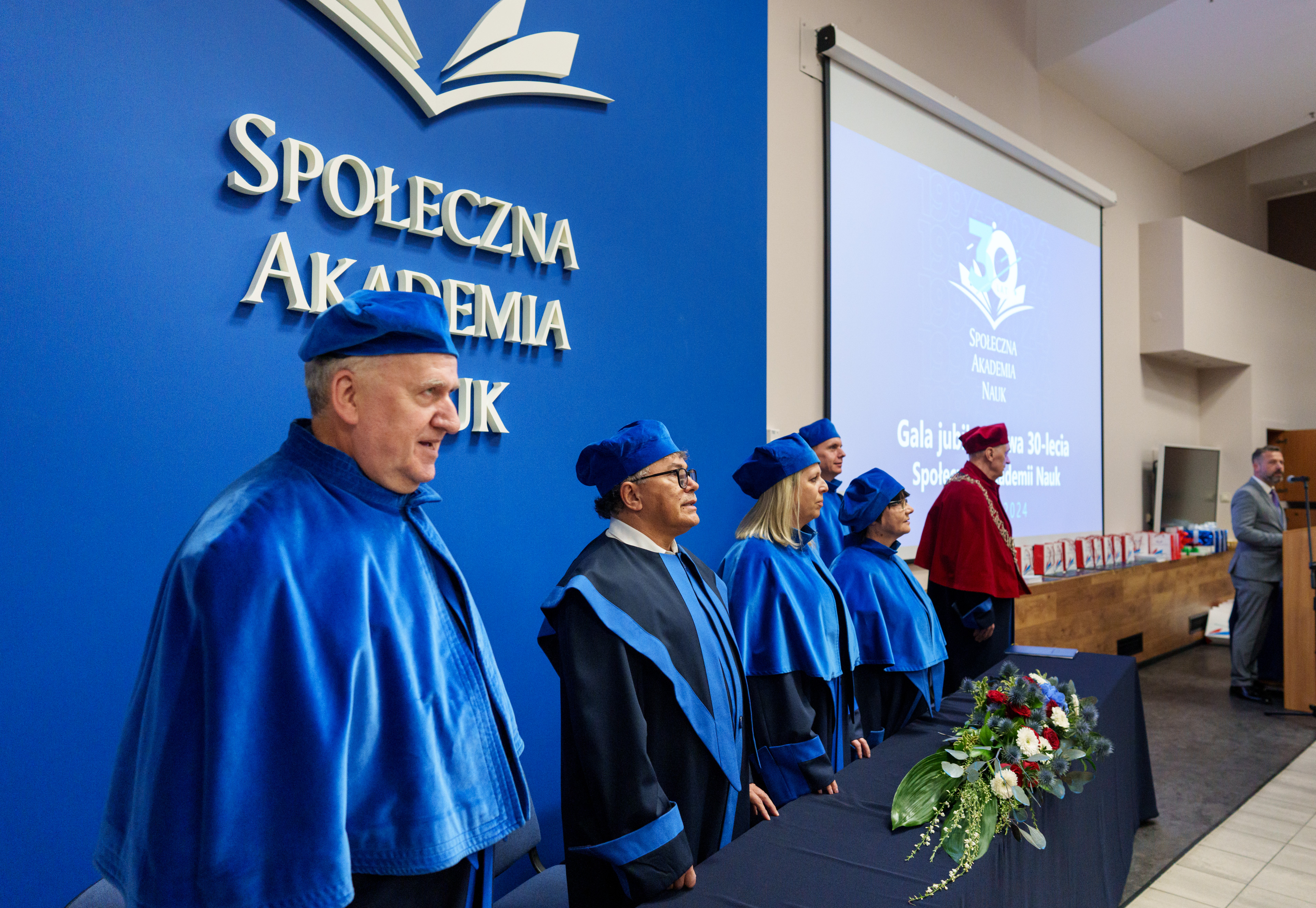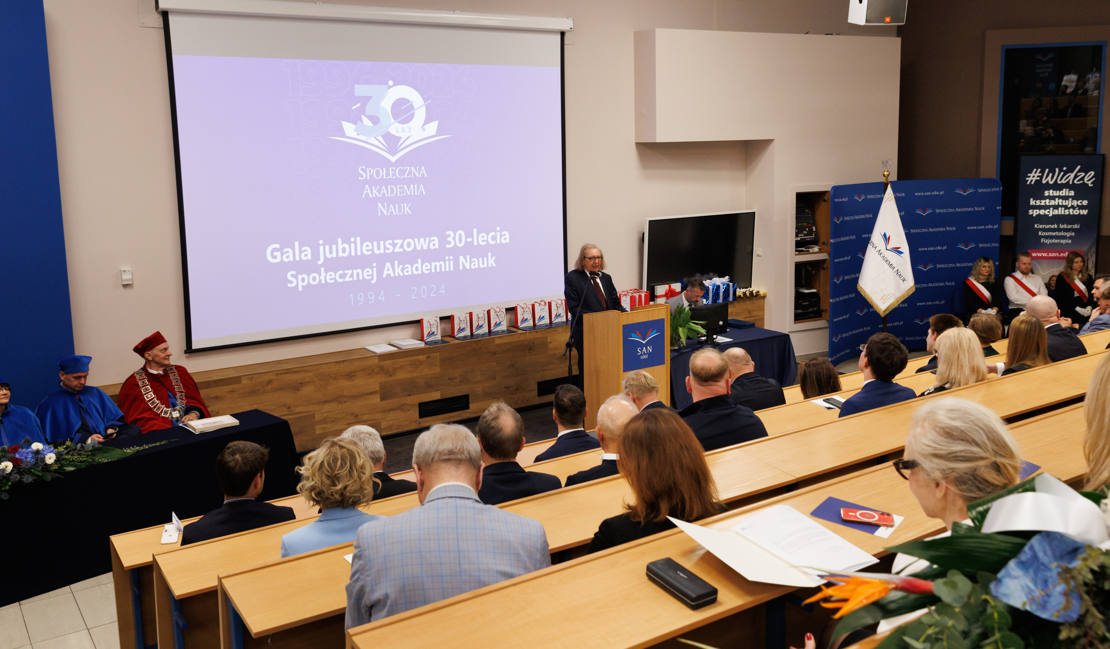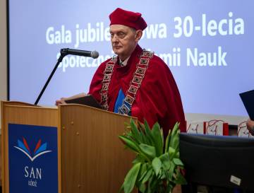 Gala rozpoczęła się od wprowadzenia orszaku profesorskiego i sztandaru uczelni. Uroczystość prowadził dr Łukasz Prysiński, prof. SAN, który serdecznie powitał zgromadzonych gości. Następnie głos zabrał Rektor Społecznej Akademii Nauk, dr hab. Roman Patora, prof. SANpodkreślając znaczenie 30 lat pracy, rozwoju i wkładu uczelni w edukację i naukę w Polsce.