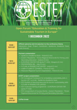 Serdecznie zapraszamy do udziału w bezpłatnej międzynarodowej Konferencji Finalnej projektu Erasmus+ ESTET pt. "Edukacja i szkolenia na rzecz zrównoważonej turystyki w Europie", która odbędzie się 1 grudnia 2022 roku w budynku Społecznej Akademii Nauk przy ul. Łuckiej 11 w Warszawie o godzinie 10.