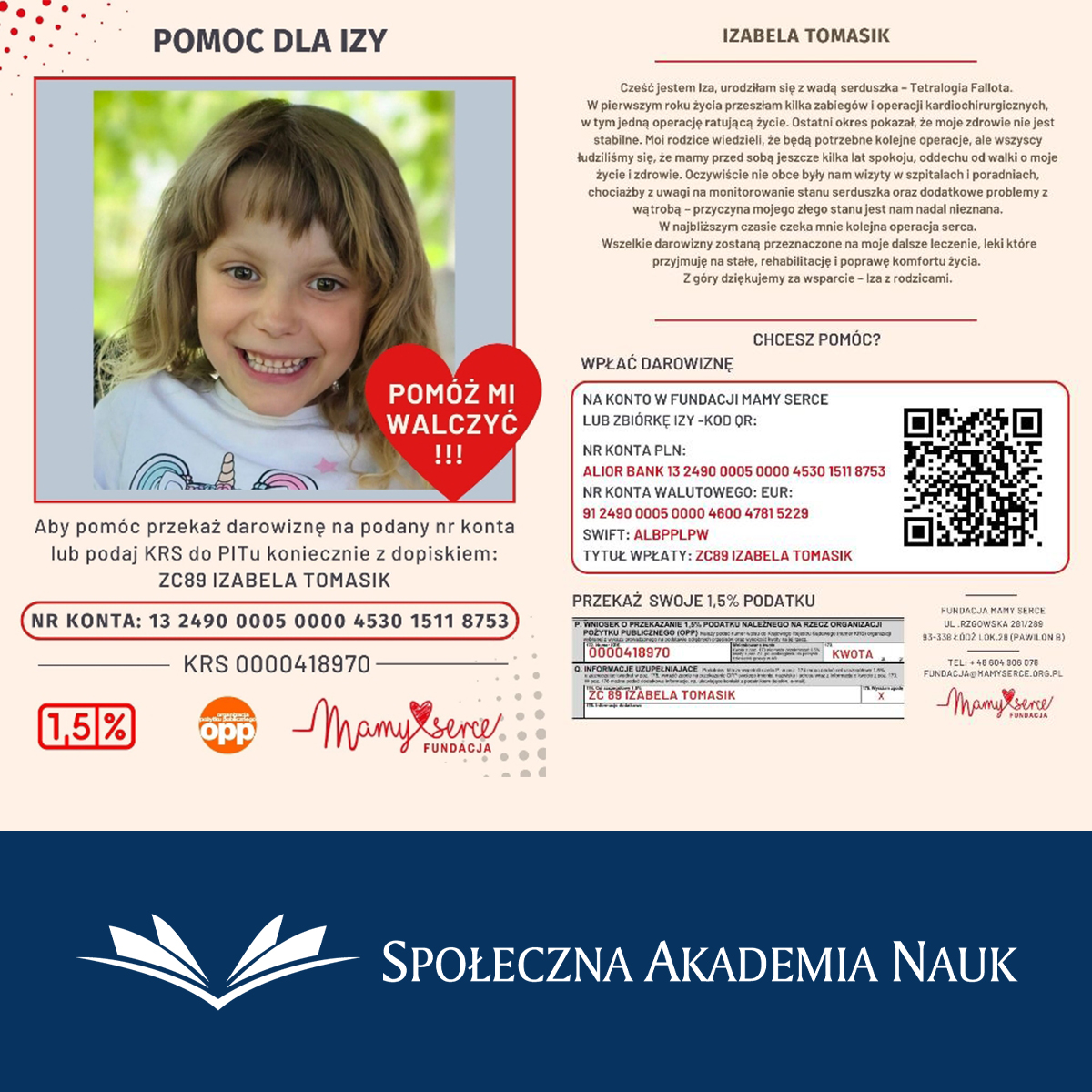 Izabela Tomasik to mała wojowniczka, która od urodzenia zmaga się z wadą serca – Tetralogią Fallota. Przeszła już kilka operacji, ale przed nią kolejne wyzwania. Jej rodzina zbiera środki na leczenie, rehabilitację i leki, które są niezbędne dla poprawy jej zdrowia i komfortu życia.