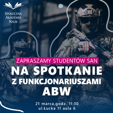 Społeczna Akademia Nauk organizuje spotkanie z Agencję Bezpieczeństwa Wewnętrznego, które odbędzie się 21 marca o godzinie 11:30 w auli nr 6, ul. Łucka 11.