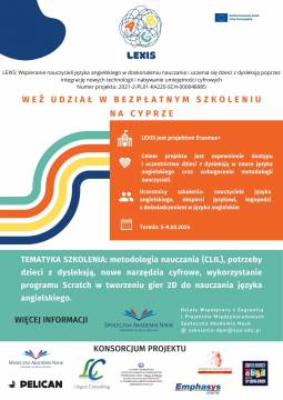 Szkolenie jest realizowane w ramach projektu Erasmus + LEXIS: Wspieranie nauczycieli języka angielskiego w doskonaleniu nauczania i uczenia się dzieci z dysleksją poprzez integrację nowych technologii i nabywanie umiejętności cyfrowych, którego celem jest zapewnienie dostępu i uczestnictwa dzieci z dysleksją w nauce języka angielskiego oraz wzbogacenie metodologii nauczycieli.