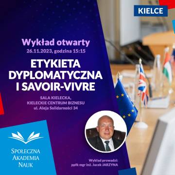 Zapraszamy do udziału w otwartym wykładzie „Etykieta dyplomatyczna i savoir-vivre”, podczas którego przedstawione zostaną wszystkie najważniejsze aspekty współczesnej etykiety dyplomatycznej oraz łączące się z nią elementy protokółu dyplomatycznego i ceremoniałów.