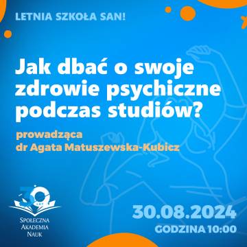Czym jest zdrowie psychiczne i jak o nie zadbać? Jak poradzić sobie w sytuacjach nadmiernego stresu czy uczucia niepokoju? W jaki sposób wspierać innych w trudnościach związanych ze zdrowiem psychicznym? Na te i inne pytania odpowiemy podczas warsztatów stacjonarnych„Jak dbać o swoje zdrowie psychiczne podczas studiów?” prowadzonych przez dr Agatę Matuszewską-Kubicz.Porozmawiamy także o nawykach wpływających na nasz dobrostan oraz strategiach radzenia sobie z uczuciem niepokoju. Poruszymy również temat tego, gdzie jako osoby studiujące możemy poszukiwać wsparcia dla siebie i innych w obszarze zdrowia psychicznego.