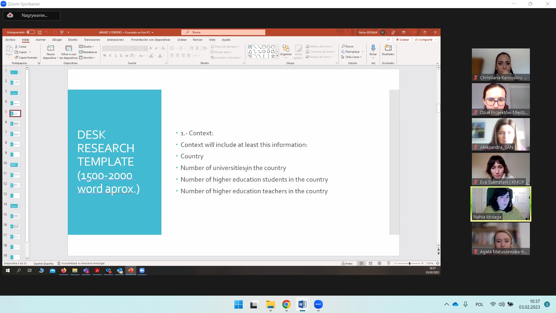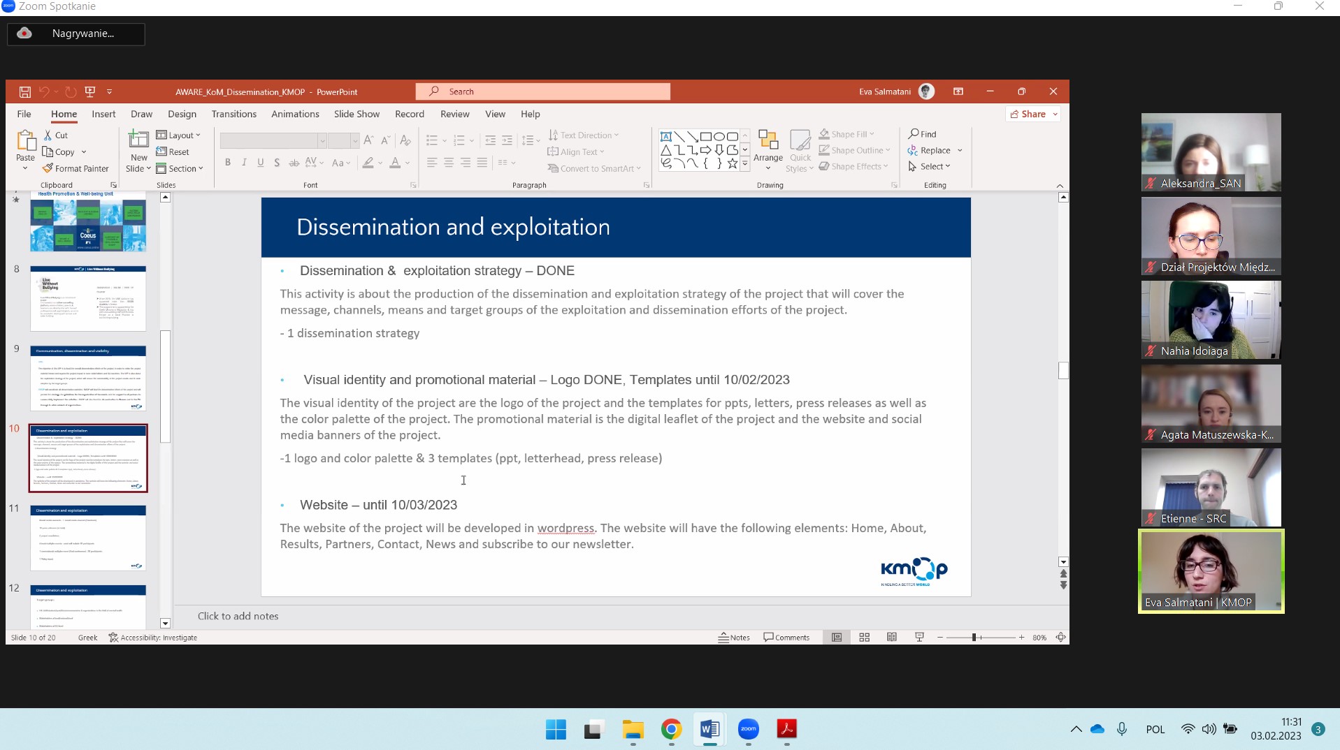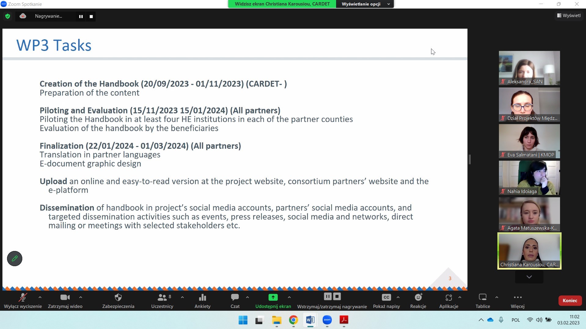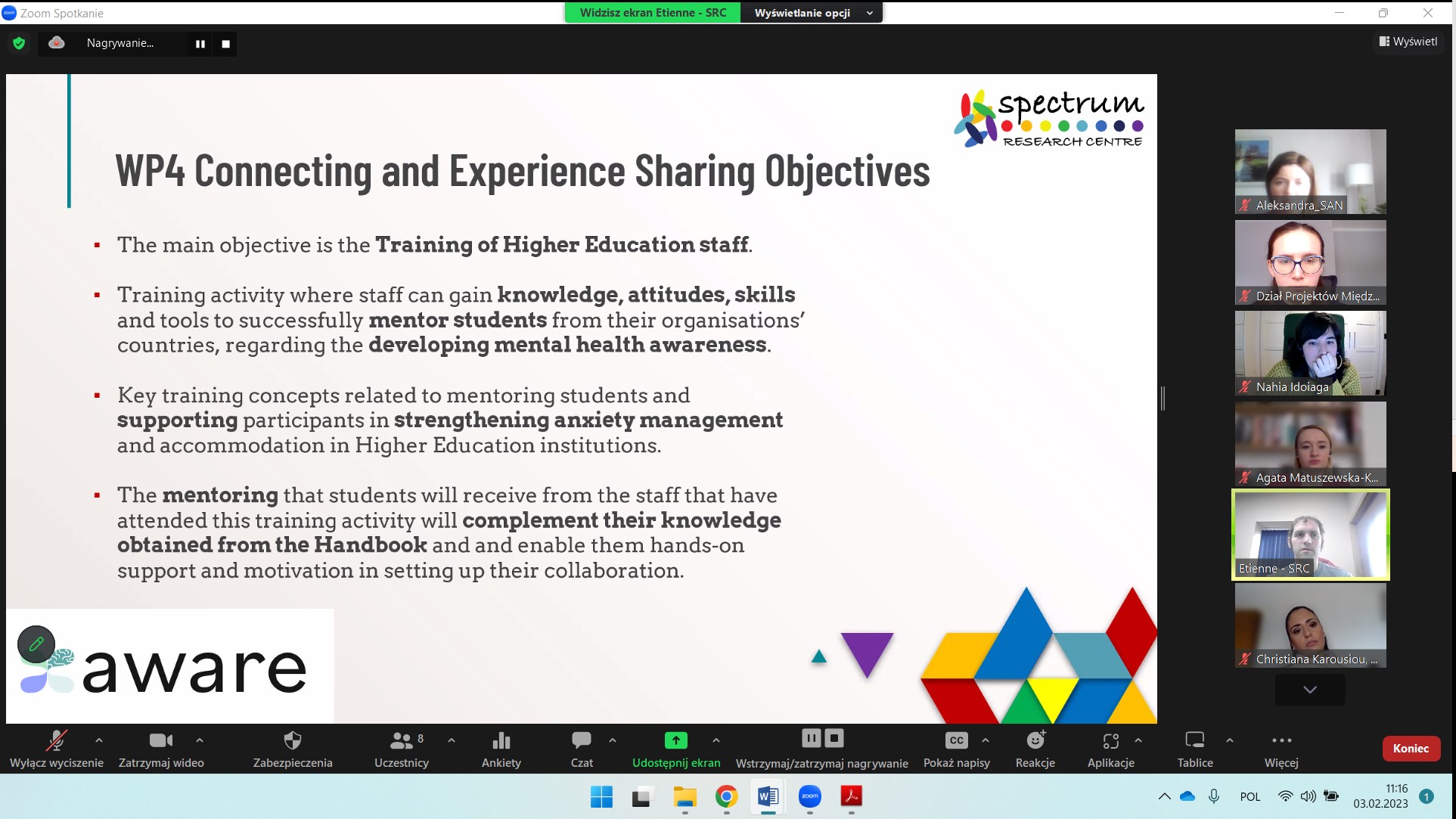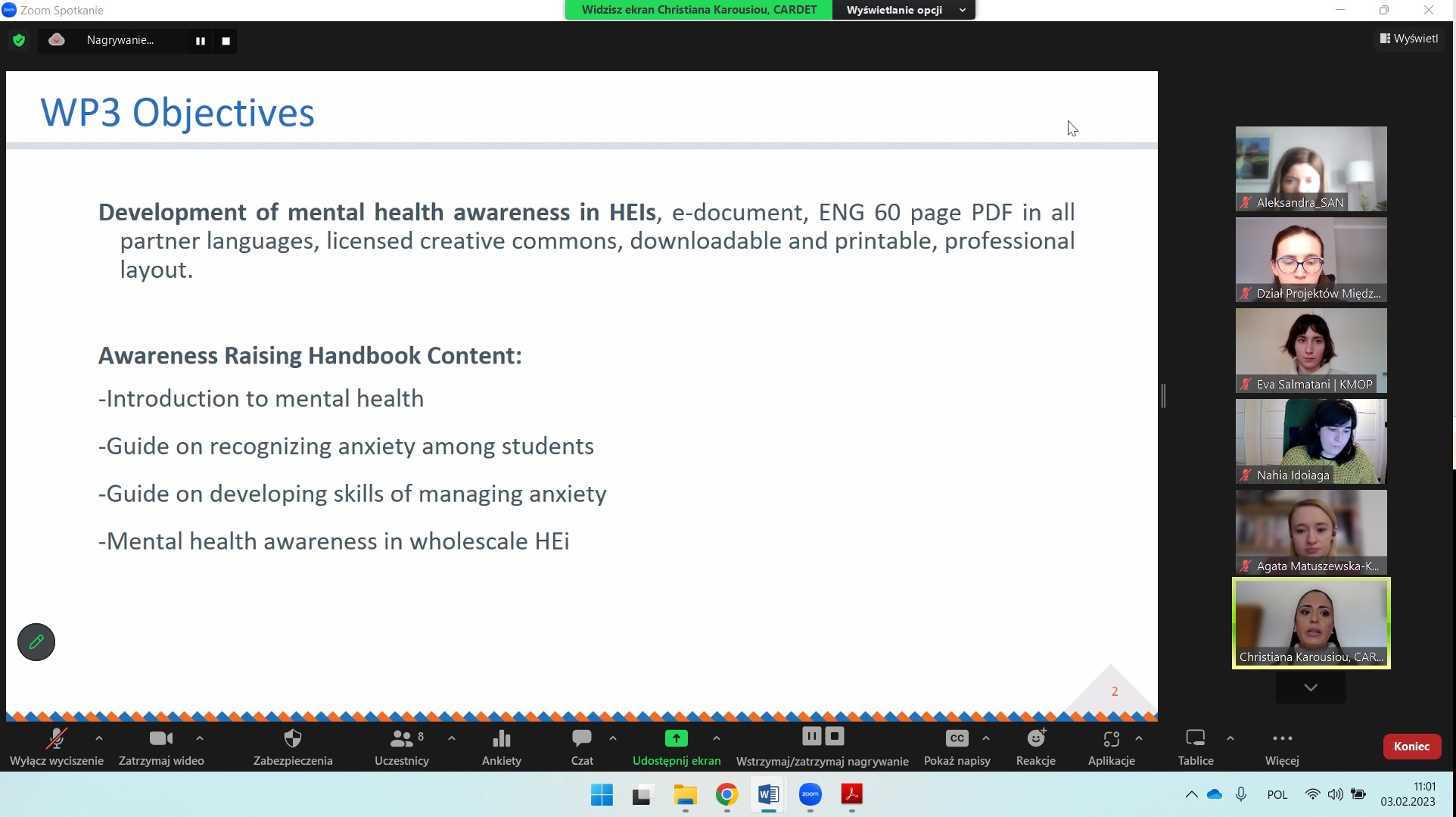 3 lutego 2023 partnerzy projektu AWARE: Increasing Anxiety awareness in higher education during (post) Covid-19 pandemic odbyli kick-off meeting w formie zdalnej. Na spotkaniu szczegółowo omówiliśmy wszystkie pakiety robocze, które będziemy realizować przez cały czas trwania projektu, a także kwestie zapewnienia jakości, bieżącego zarządzania oraz upowszechniania rezultatów projektu.