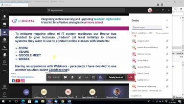 Podczas konferencji każdy z partnerów przedstawił swoją instytucję oraz podsumował wypracowane rezultaty intelektualne. Uczestnicy mieli okazję dowiedzieć się w jaki sposób można zarejestrować się na platformie GoDigital oraz jakie moduły zawiera. W drugiej części spotkania uczestnicy mogli zapoznać się z aplikacjami, które były wykorzystywane podczas nauczania zdalnego w krajach partnerskich. Przedstawione zostały: ClickMeeting, WEBEX, Zoom, Google Classroom, Microsoft Teams oraz PowerPoint. Każdy z występujących opisał zalety oraz wady powyższych aplikacji oraz ich funkcje. Ostatnią częścią konferencji był panel dyskusyjny na temat praktycznych doświadczeń nauczycieli szkół podstawowych w zakresie wykorzystania nowoczesnych technologii w edukacji szkolnej. Uczestnicy mieli okazję do podzielenia się swoim doświadczeniem związanym z używaniem aplikacji wspomagających zdalne nauczanie podczas pandemii Covid-19.