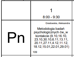 W kratkach, w których podane są przedmioty znajduje się również numer sali, w której odbywają się zajęcia oraz nazwisko prowadzącego. Daty lub numery zjazdów, które podane są przy nazwie przedmiotu oznaczają, że w tych terminach będą odbywać się dane zajęcia.